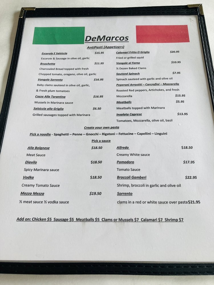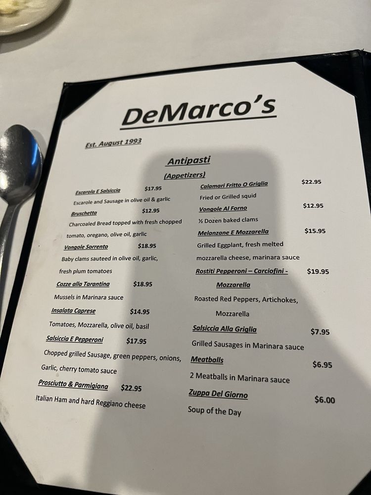 DeMarco's Restaurant in Itasca, IL, offers a classic Italian dining experience with a variety of options for both dine-in and carry-out. The menu boasts traditional dishes like Chicken Parmigiana and Marsala, as well as unique offerings like Grilled Polpo and Bruschetta. Customers praise the attentive staff, cozy ambiance, and generous portions. The soup of the day selection adds a comforting touch to the meal, while the savory appetizers like Baked Clams and Grilled Sausage set the stage for a delightful dining experience. Don't miss out on their well-loved Chicken Limone and the flavorful Bucatini Calabrese. DeMarco's is a go-to spot for those craving authentic Italian flavors in a relaxed setting.